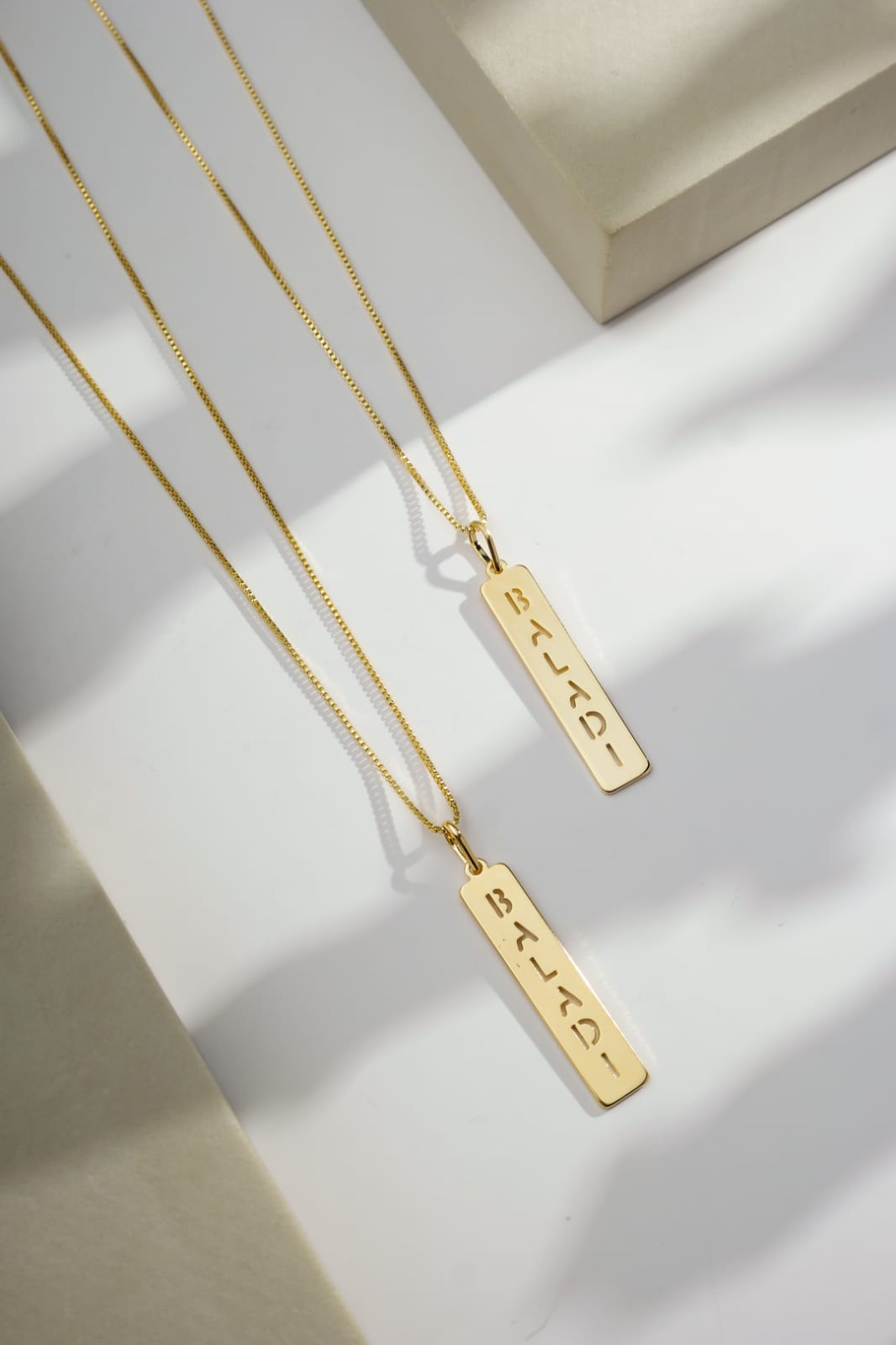 Elegante e minimalista, o colar Lâmina foi especialmente criado para homenagear a rica herança das danças Folclóricas e populares àrabes. Com um pingente retangular delicado e personalizado, ele traz um toque cultural sofisticado ao seu visual.